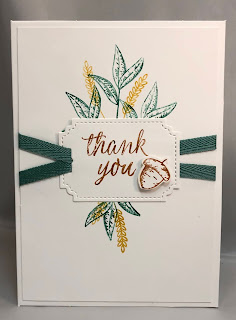 SEPTEMBER!! It is the beginning of the "BER" months when it is all about Fall!! And it is the cue card for the current CASology challenge. Perfect challenge for the new Beautiful Autumn bundle from Stampin Up. This bundle has three punches that match the stamps...the acorn is my favorite!! The cute little stitched tag is also new in Stampin Up's Holiday Mini catalog...Peek-A-Hoot dies!! Adorable!! Stay tuned to see the matching owls!!